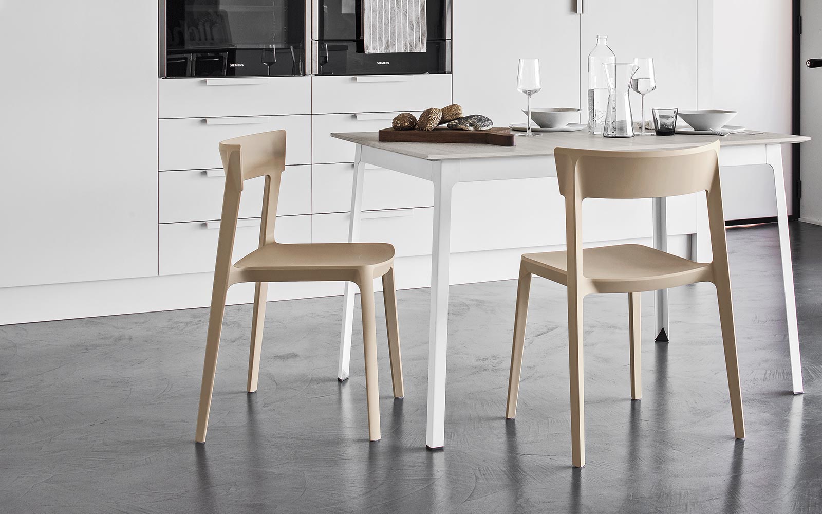 Monoblock chair realized with the airmoulding injection technique. This process provides exceptional sturdiness, as well as reducing the product weight. The highly-resistant shockproof feet in polyethylene are interchangeable. Available in the polypropylene, suitable for outdoor use, or in biomaterial: a mix of polymer and recycled wood.